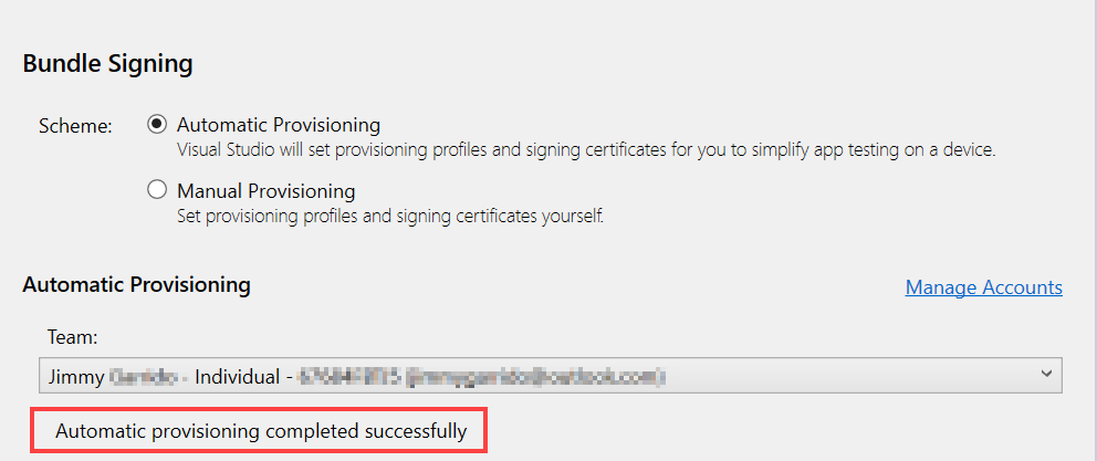 자동 서명 프로세스를 시작하기 전에 Apple 계정 관리 가이드에 설명된 대로 Visual Studio에 Apple ID를 추가했는지 확인해야 합니다.