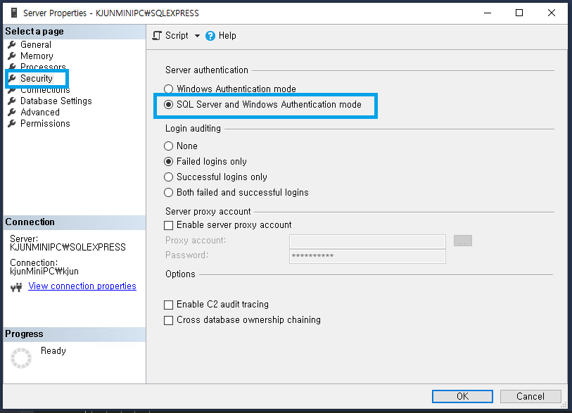 데이터베이스 속성에서 Security > SQL Server and Windows Authentication mode 를 선택하면된다.