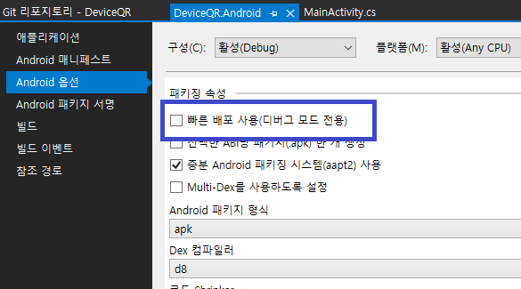 아래처럼 빠른 배포 사용(디버그 모드 전용) 을 체크 해제하면 된다.