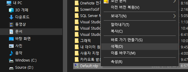 내 PC -> 문서 -> Default.rdp 파일 삭제