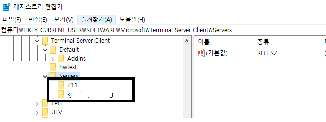 컴퓨터\HKEY_CURRENT_USER\SOFTWARE\Microsoft\Terminal Server Client\Servers 으로 이동