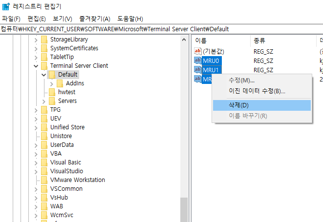 컴퓨터\HKEY_CURRENT_USER\SOFTWARE\Microsoft\Terminal Server Client\Default 으로 이동