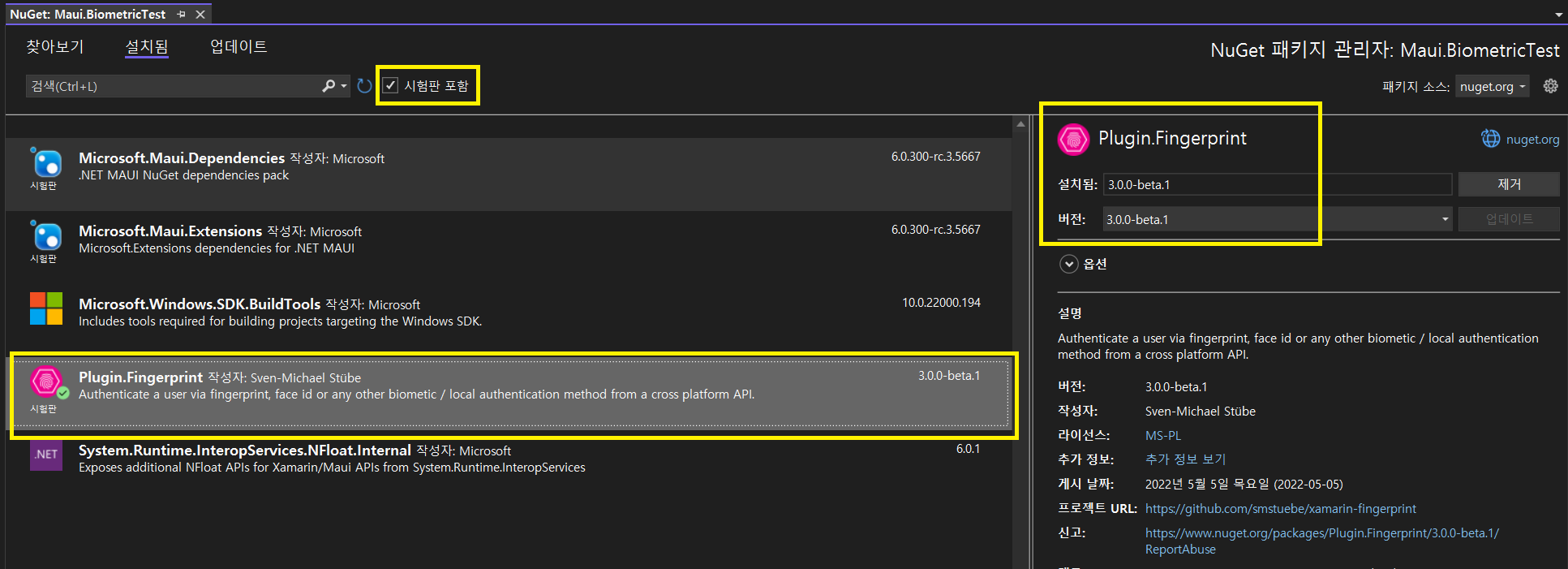 Nuget 패키지 관리에서 시험판 포함 체크후 Plugin.Fingerprint 3.0.0-beta.1 설치