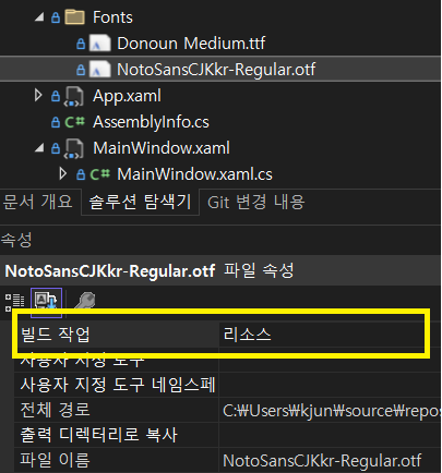 폰트의 속성창에서 아래처럼 리소스(Resource)를 선택한다.