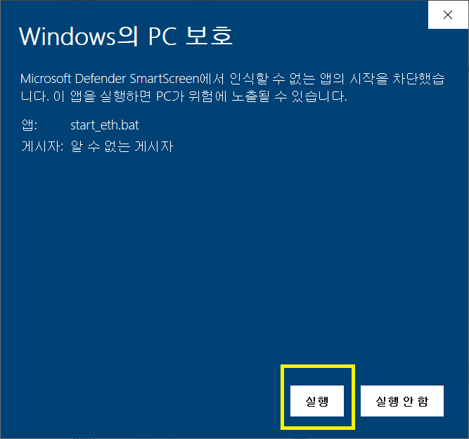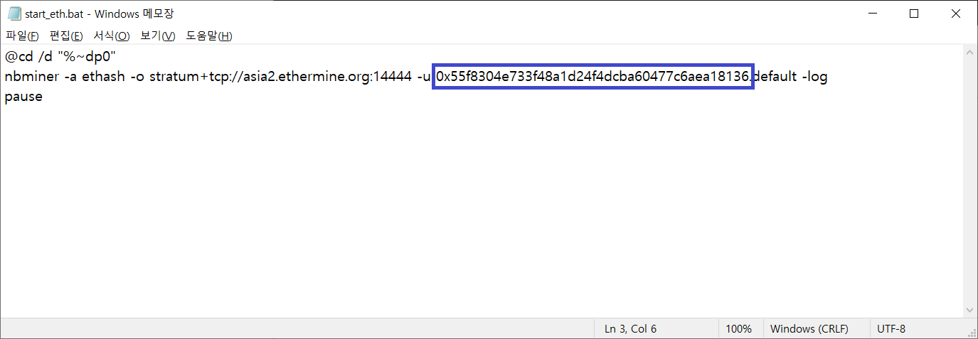 4. start_eth.bat 파일을 편집으로 열어서 아래 처럼 지갑주소 변경
