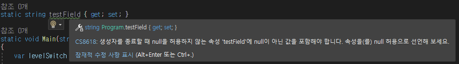 이를 무시하고 싶을때 아래처럼 프로젝트 속성의 빌드>일반 탭에서 'Null 허용' 을 사용안함으로 처리하면된다.