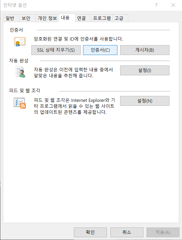 인터넷 옵션에서 내용 탭의 인증서 선택
