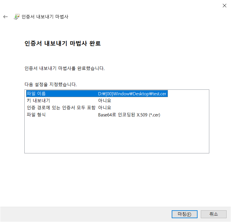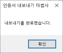 발급대상 목록중 하나를 선택하고 "내보내기" 선택하면 인증서 내보내기 마법사 창이 열림