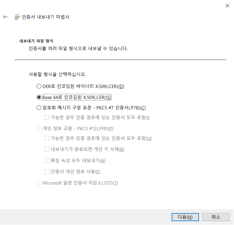 Base로 인코딩된 X.509(.CER)(S) 를 선택하고