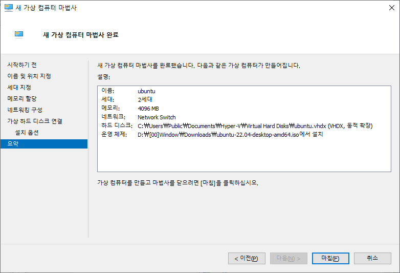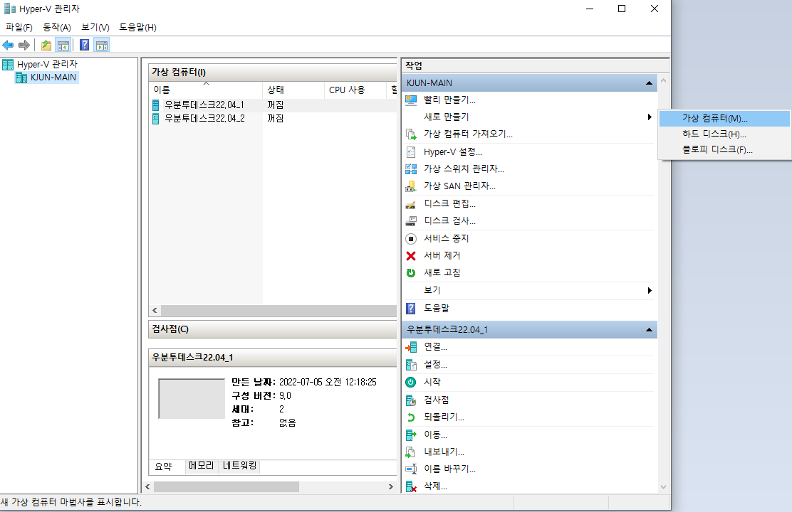 Hyper-V 관리자 우측의 새로 만들기>가상컴퓨터 선택