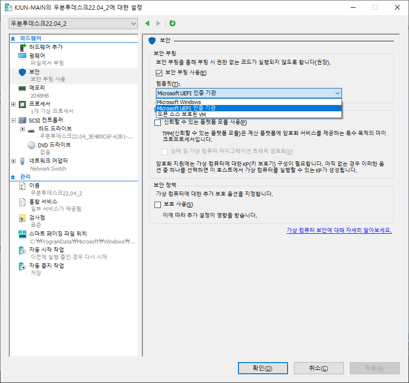 이제 설정을 건드려줘야하는데 만들어진 가상컴퓨터를 선택하고 설정을 선택하여 설정 팝업에서 보안탭의 탬플릿을 UEFI 인증기관으로 변경한다.