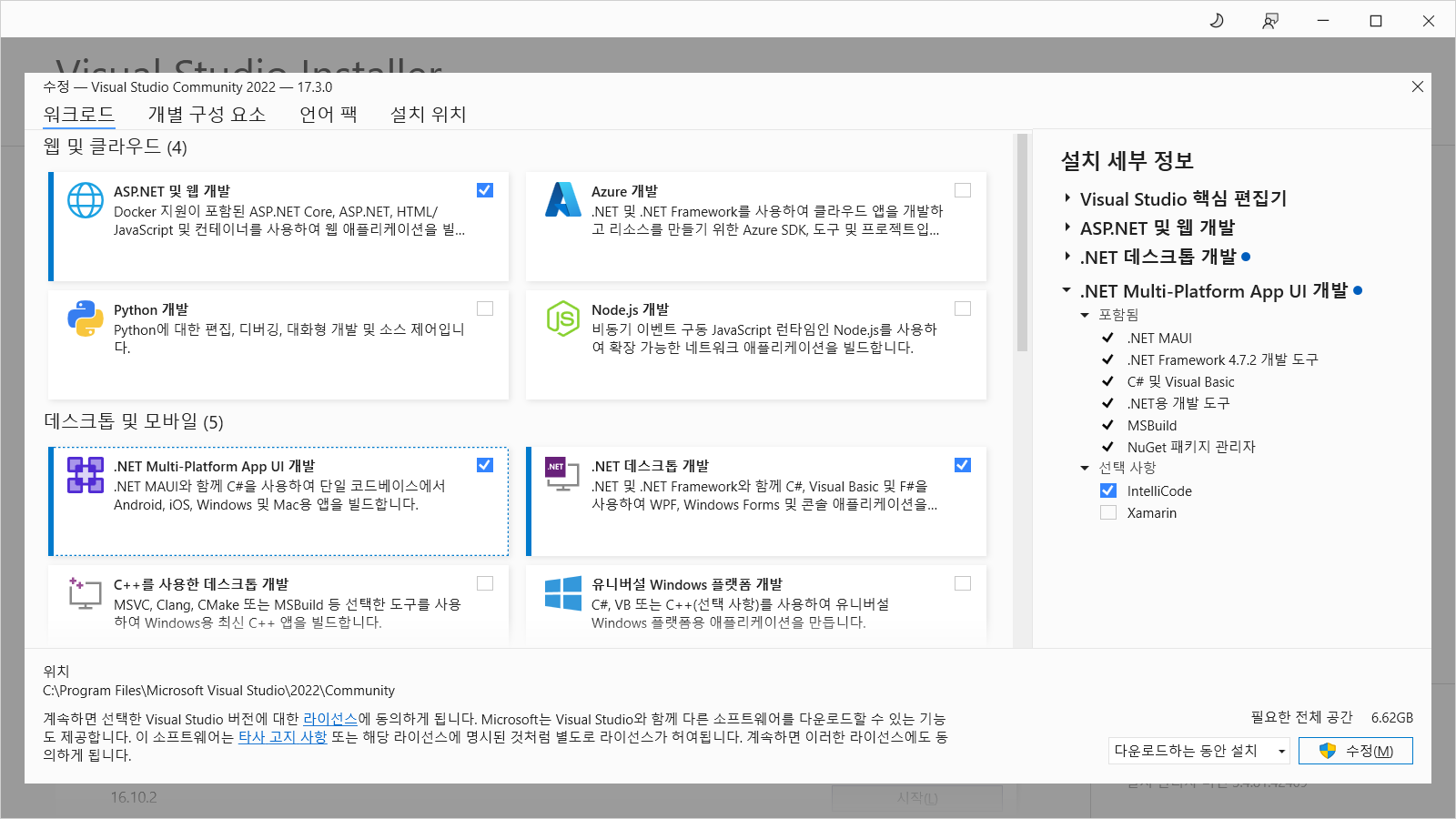 Visual Studio Installer 에서 업데이트 진행 후 수정을 눌러 아래 처럼 .NET Multi-Platform App UI 개발을 체크 해줘야한다.