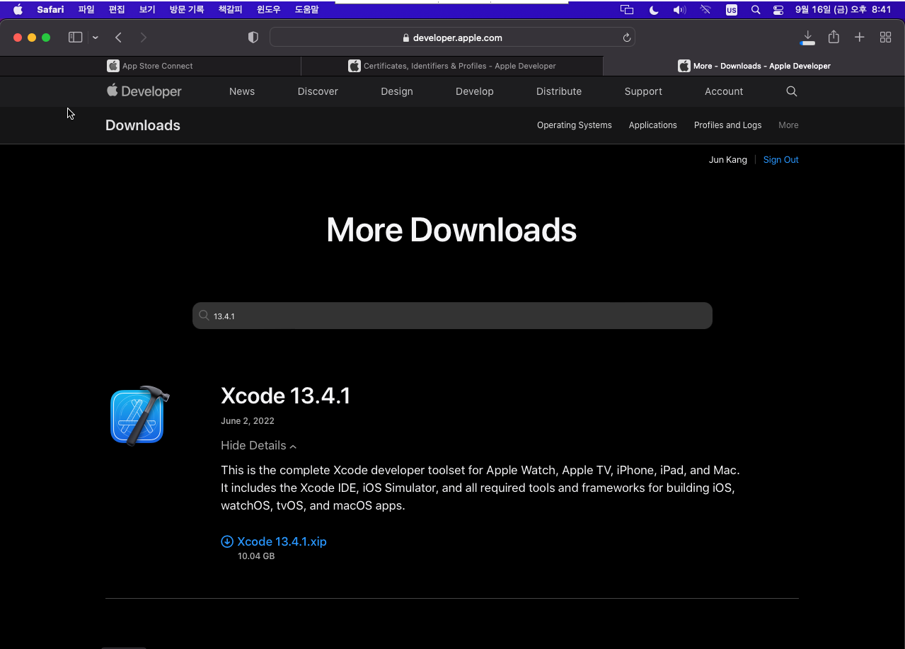 아래 링크로 들어가 로그인후 13.4.1 로 검색하여 구버전 xcode 를 다운받고 설치합니다. (10G)