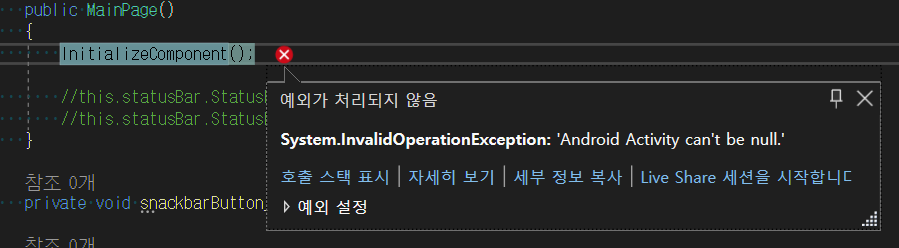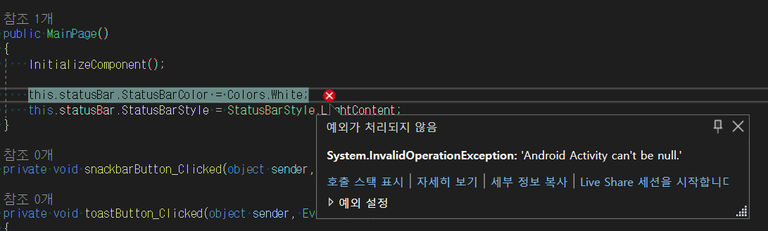 아래 처럼 XAML 단에 정의한 경우도 위와 같은 에러가 발생됩니다.