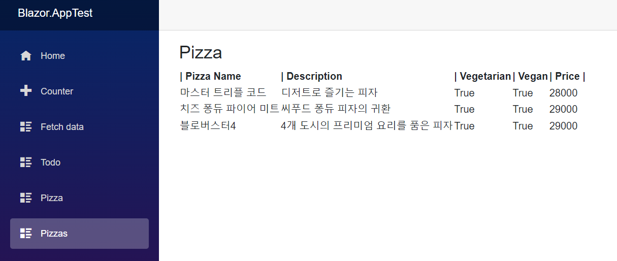 pizzaItems[0] = new PizzaItem() { PizzaId = 1, Name = "마스터 트리플 코드", Description = "디저트로 즐기는 피자", Price = 28000, Vegan = true, Vegetarian = true };