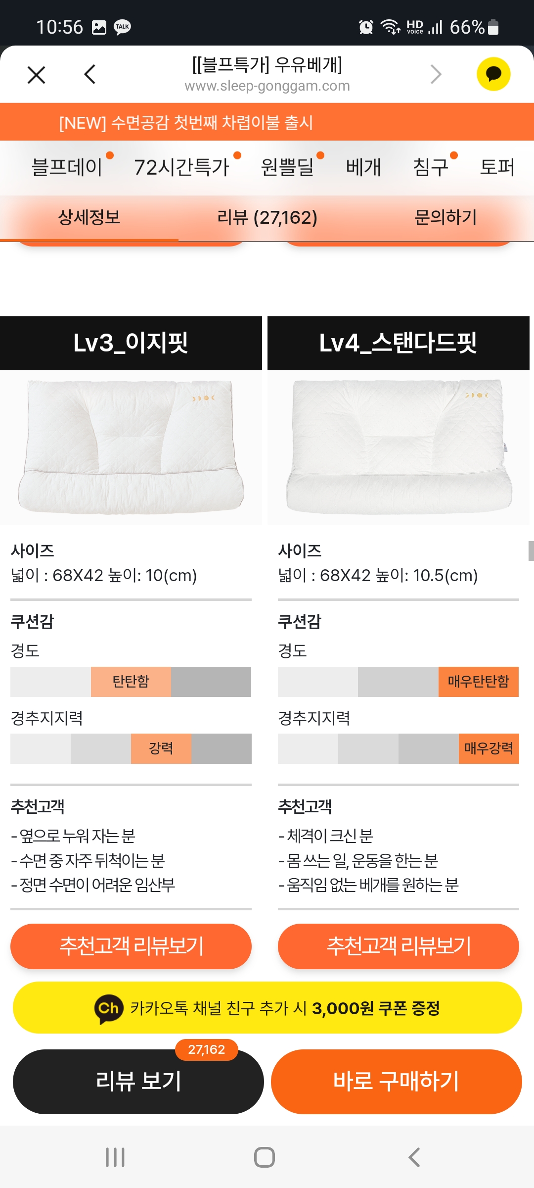 기존 베개가 이지핏이고 새로 산 베개가 스탠더드 핏