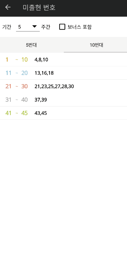 기간별 미출현 번호를 5/10번대 별로 나타냅니다.