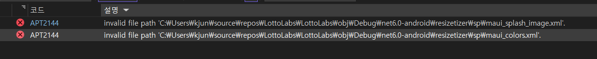 오류 APT2144 invalid file path 'C:\Users\kjun\source\repos\LottoLabs\LottoLabs\obj\Debug\net6.0-android\resizetizer\sp\maui_splash_image.xml'. LottoLabs C:\Program Files\dotnet\packs\Microsoft.Android.Sdk.Windows\32.0.476\tools\Xamarin.Android.Aapt2.targets 123