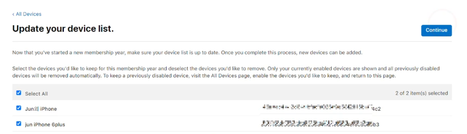 Continue 버튼을 눌러 계속 사용할 기기 목록을 선택하고