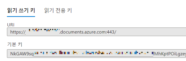 Azure Portal 로 접속하여 키 를 선택하면 아래처럼 URI, 기본키 가 나타납니다.
