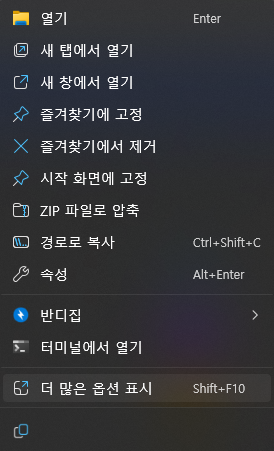 Windows 11로 업그레이드를 했는데 마우스 우클릭메뉴가 아래처럼 '더 많은 옵션 표시'가 생겼습니다.