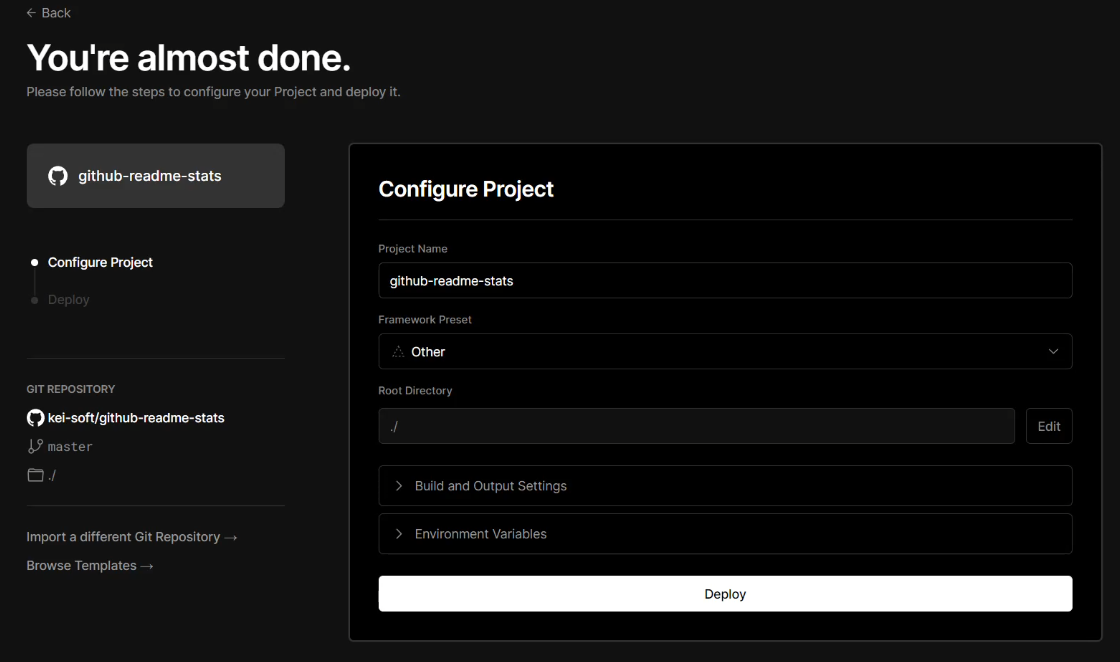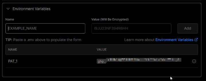 Import 가 끝나면 아래처럼 배포 화면이 나오는데 Environment Variables에 키는 PAT_1으로 값은 위에서 발급받은 token을 넣고 Add 하고 Deploy 합니다.