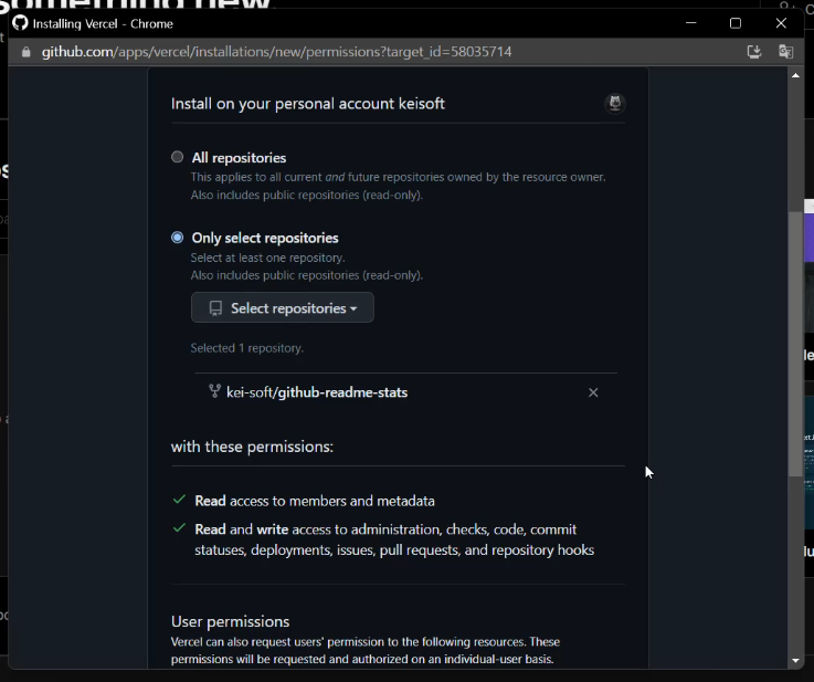 팝업창이 뜨는데 아까 Fork 한 Repo를 선택하고 install 합니다.