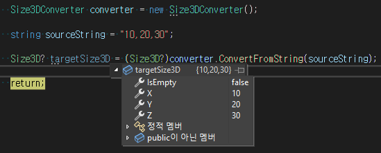 Size3DConverter 클래스의 ConvertFromString 메소드를 사용하면 문자열을 Size3D 객체로 변경할 수 있습니다.
