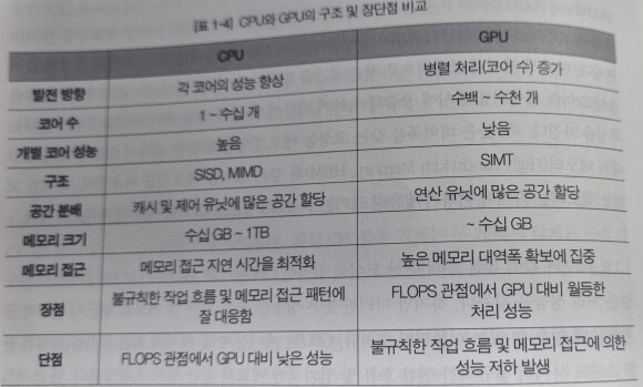 단점 | FLOPS 관점에서 GPU 대비 낮은 성능 | 불규칙한 작업 흐름 및 메모리 접근에 의한 성능 저하 발생 |