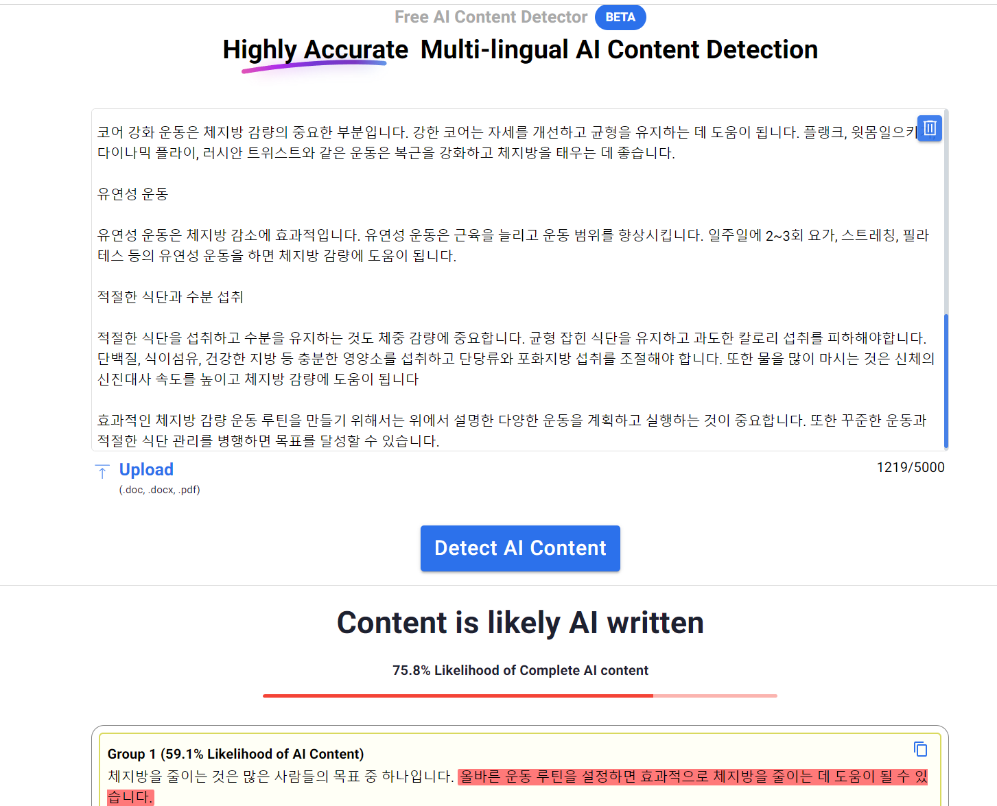 아래 사이트에서 글을 넣고 확인하면 AI 기 쓴글인지 확인해줍니다.