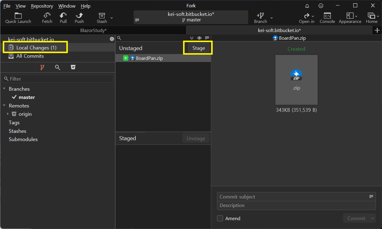Stage 버튼을 눌러 커밋할 항목을 Staged 쪽으로 보냅니다.