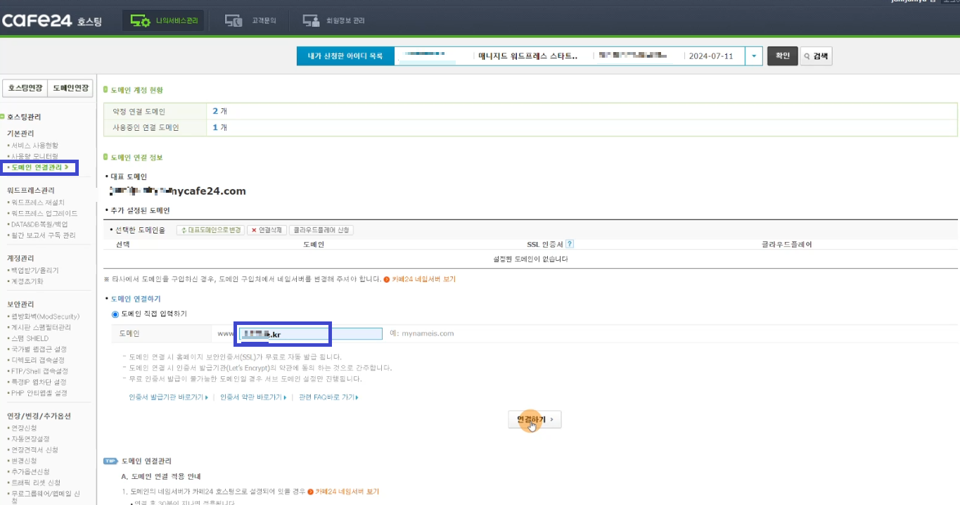 Cafe24 매니지드 워드프레스는 도메인 연결 및 무료 SSL 적용하는 방법을 알아보겠습니다.