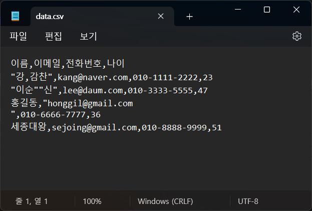 이를 사용하면 CSV 문자열에 ,(콤마)나 "(쌍따옴표), 개행문자 등도 처리할 수 있습니다.