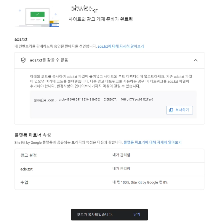 아래처럼 ads.txt 에 넣을 데이터를 복사하기 합니다.