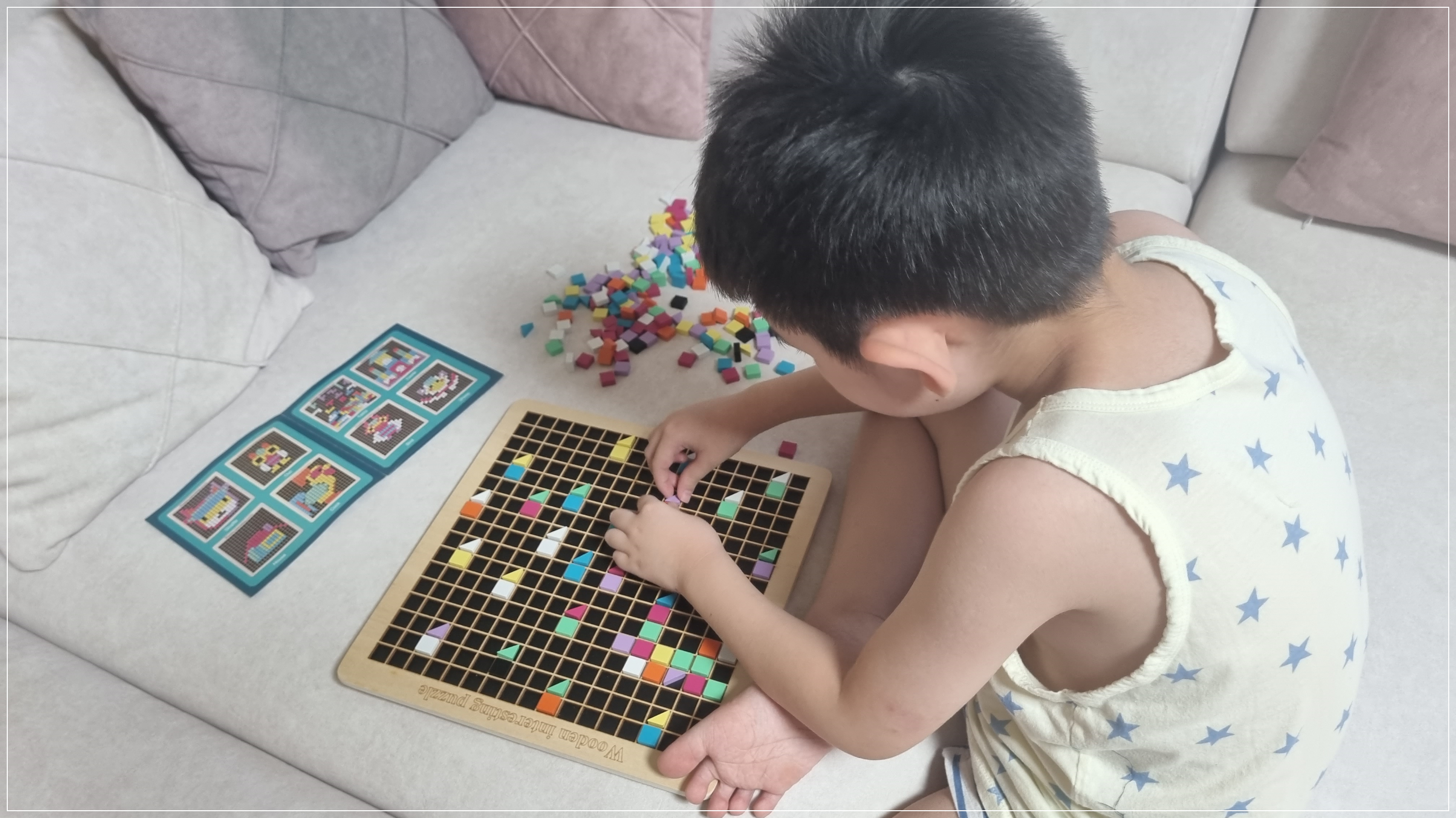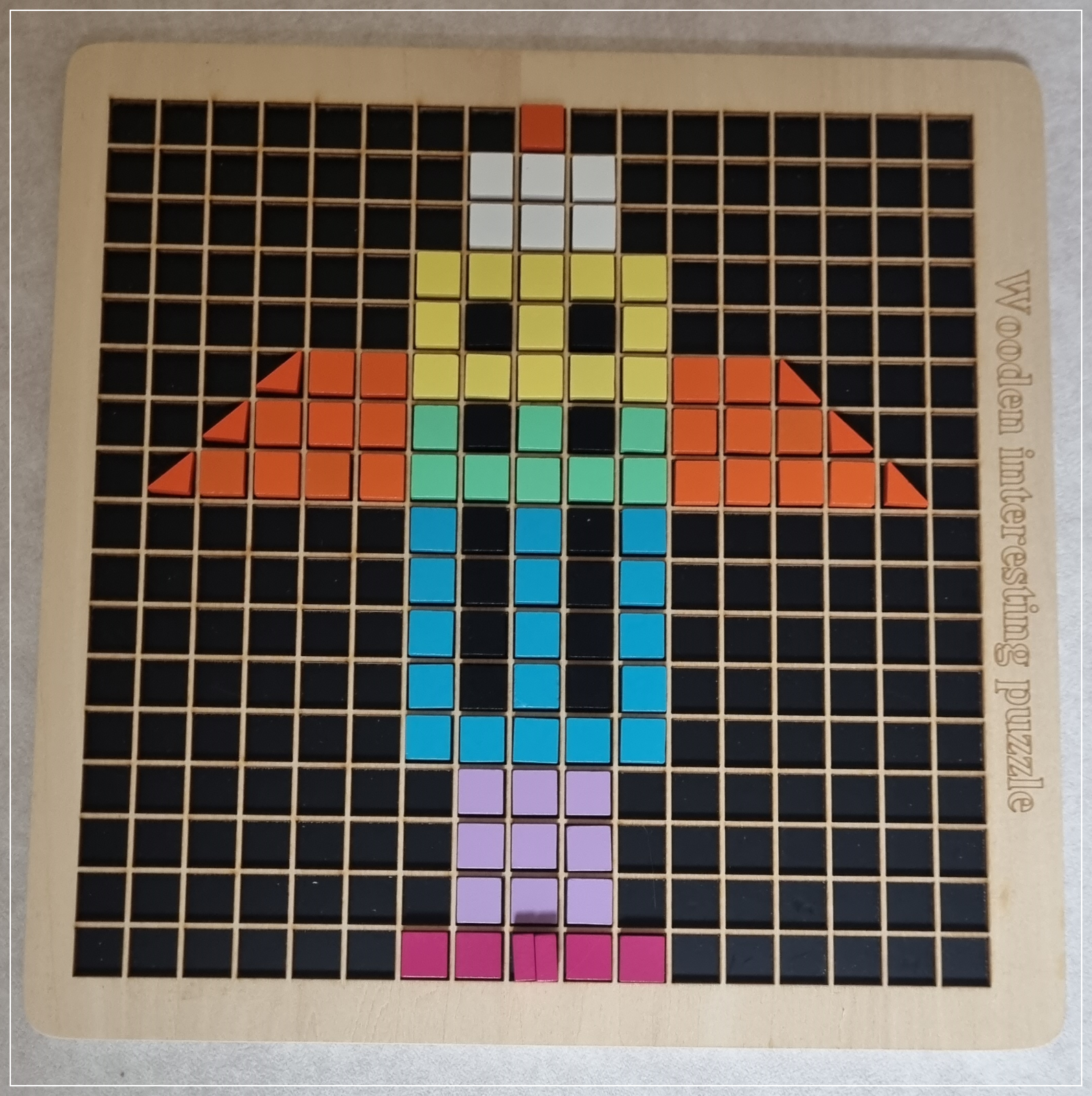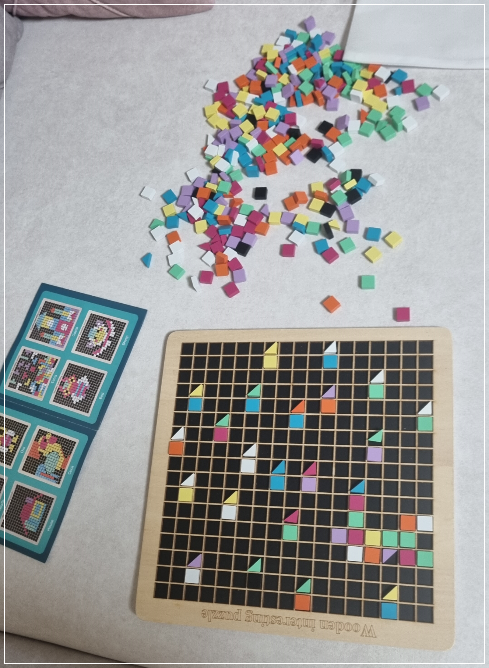 나무조각이 사각형과 세모 모양으로 되어있고 퍼즐판에 그 조각들을 놓아