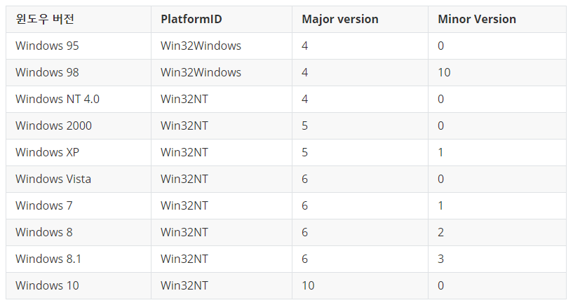 위처럼 OS 종류와 버전정보를 가져올 수 있으며 각 정보는 아래 정보를 참고하면 됩니다.