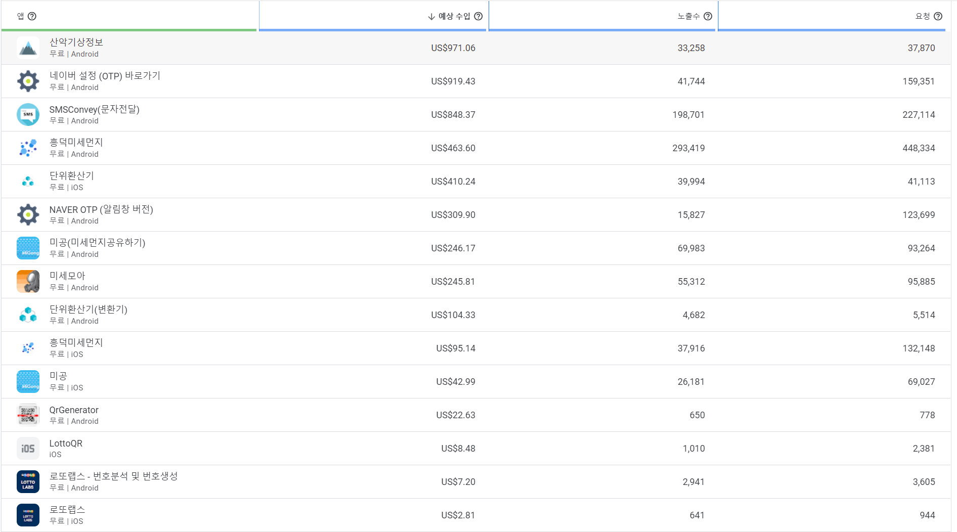 요청수와 수익이 비례하지 않는데 아마도 광고 단위가 전면광고와 배너 광고가 있어서 그런것같다