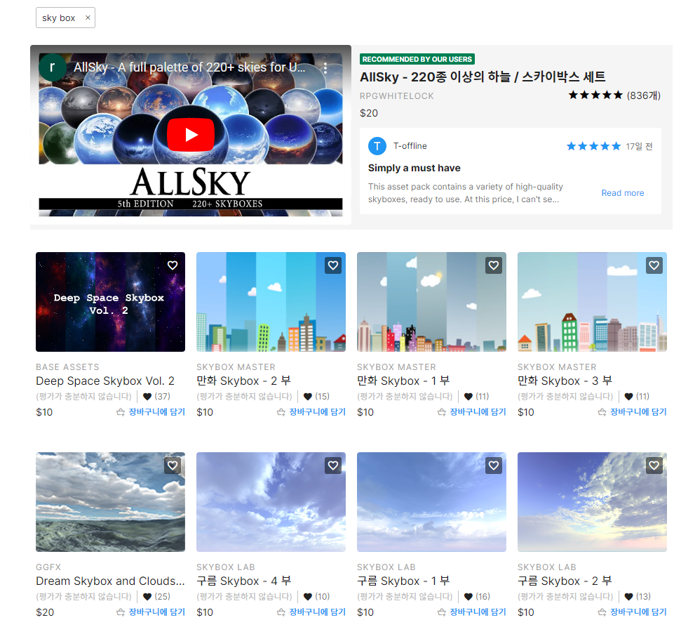 Asset Store에서 sky box로 검색하면 여러 가지 Asset들이 검색되는데 그중에 맘에 드는 것을 선택하고 import 합니다.