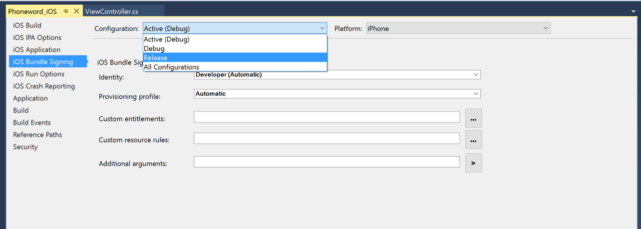 - 대부분의 경우 서명 ID 및 프로비전 프로필은 기본값(자동)으로 그대로 둘 수 있으며, Visual Studio에서는 Info.plist의 번들 식별자에 따라 올바른 프로필을 선택합니다.