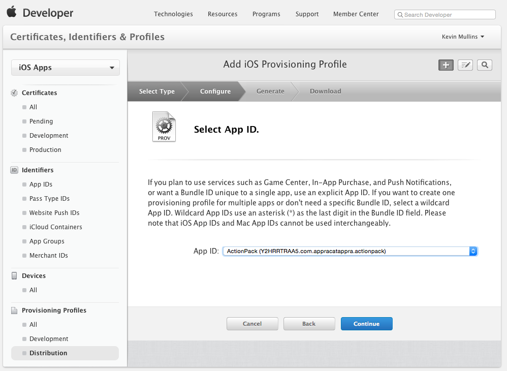 - 계속 단추를 클릭하고 드롭다운 목록에서 배포 프로필을 만들려는 앱 ID를 선택합니다.