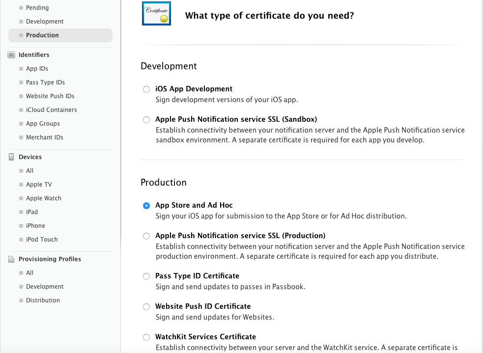 - 인증서 아래에서 프로덕션을 선택합니다.