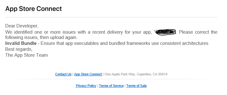 Invalid Bundle - Ensure that app executables and bundled frameworks use consistent architectures