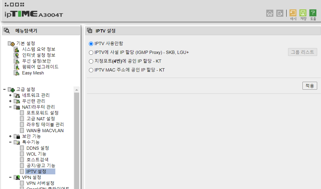 그런데 공유기를 안쓸수가 없어서 기사님이 알려준 공유기 설정에서 'IPTV 사용안함' 으로 아래처럼 바꿔봤다.