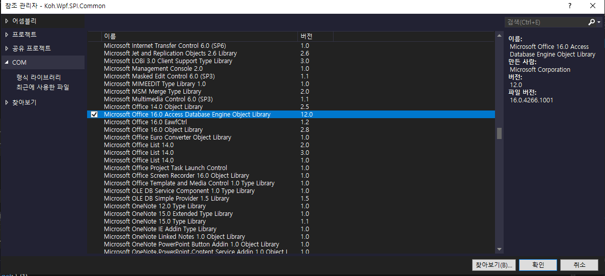 'Microsoft Office 16.0 Access Database Engine Object Library' 항목을 추가한다.