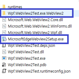프로그램을 실행하면 MicrosoftEdgeWebview2Setup.exe 파일을 다운받고 실행되면서 Wpf.WebView2Test.exe.WebView2 폴더가 생성된걸 확인 할수 있습니다.
