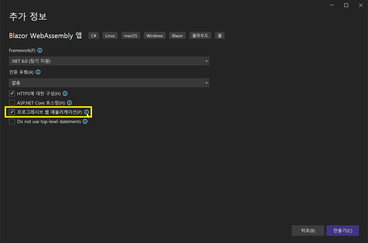 Blazor WebAssembly 프로젝트를 만들 때 아래처럼 프로그레시브 웹 애플리케이션을 체크하게 되면