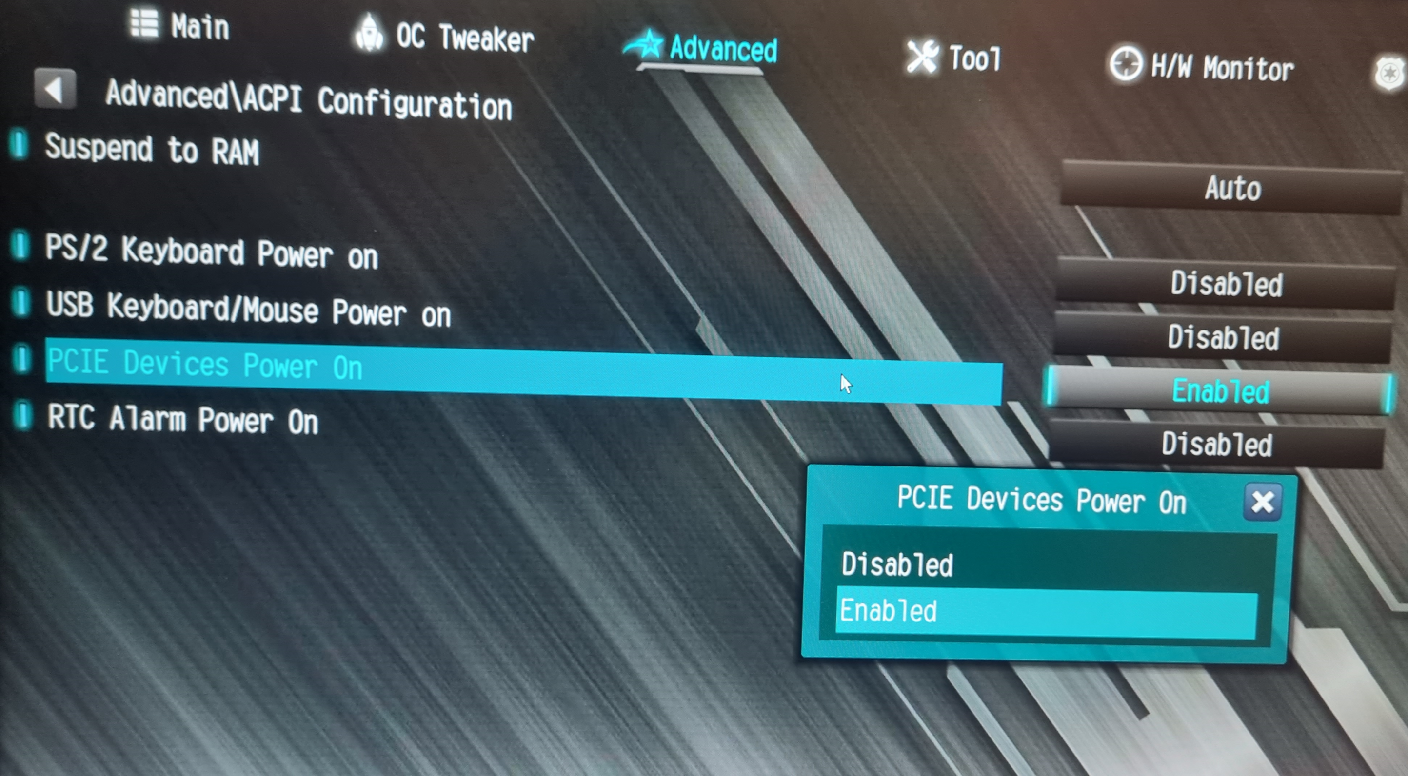 F2 키로 BIOS 진입 하고 Advanced 에서 PCIE Devices Power On 을 Enabled 로 변경합니다.