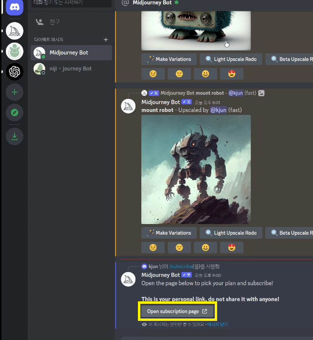 discord 화면에서 /subcribe 명령을 입력합니다.