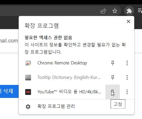 설치가 되면 주소줄 오른쪽에서 설치한 확장 프로그램을 고정합니다. (꼭 고정할 필요는 없음)