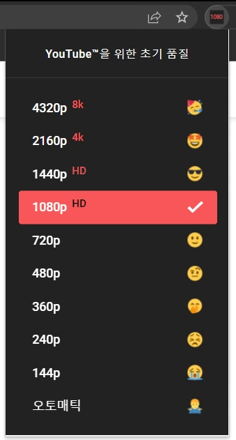 전 1080 으로 선택하고 브라우저를 끄고 켠 후 유튜브를 재생해 보았는데